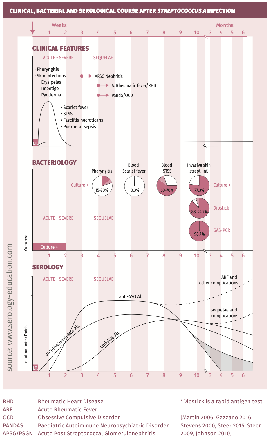 Non-suppurative sequelae of a GAS infection occur usually 1 to 3 weeks after GAS pharyngitis, or 3 to 6 weeks after a skin infection. Patients cannot always remember the episode of pharyngitis and throat cultures are negative in 75% of patients when the symptoms manifest. Even when cultures are negative for GAS, antibiotic treatment for infection or eradication of GAS carriage is recommended to reduce symptoms, prevent recurrences of PANDAS and ARF, and to reduce the risk of developing rheumatic heart disease (RHD) [Hand 2020, Lepri 2019]. Most accurate is a demonstration of a rising titer regardless of the value found (Johnson 2010, Blyth 2005) against age-stratified ULN (Upper Limit of Normal) values. If a second convalescent sample is not possible an initial ASO/ASB titer above the ULN for age is sufficient for diagnosis (Steer 2015).