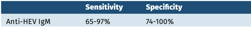 In general, the sensitivity of IgM tests for detection of a recent infection with HEV ranges between 65-97%. The specificity ranges between 74100%. There is a WHO standard as reference only for IgG. Comparing results is not possible.